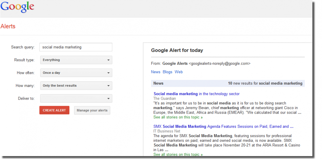 o For example, if you set up a daily Google Alert for “social media marketing”, set the “result type” to “everything” (this includes all types of media sources and broadens your result pool), you would receive a daily email of the top listings in this subject, allowing you to see the latest trends, news, and topics that are being discussed online.