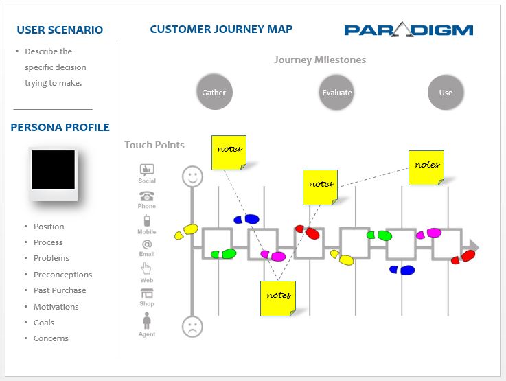 The power of journey maps is in their ability to simply and effectively communicate what potential customers think and feel as they work toward achieving their goals. It is an excellent tool for identifying and appreciating customer pain points, identifying improvement opportunities, gaps between expectations and perceptions, and sharing a common vision with your marketing partners and across your organization.