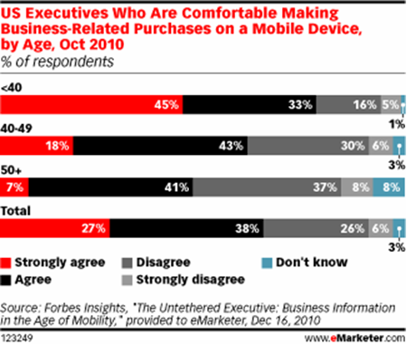 This isn’t to say that all executives in all age ranges are walking around with a smartphone, but those in the 30-49 age ranges are. This younger, more tech-savvy and increasingly mobile market is driving business Smartphone applications and mobile commerce to become the norm and not the anomaly.
