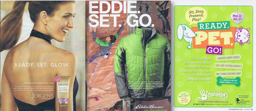 To illustrate this point, look at these three ads. The first ad is for Jergens® Natural Glow™ Moisturizers. The second ad is for a Backdraft Jacket from Eddie Bauer. The third is for a Pet-focused exhibit at the Chicago Children’s Museum. What do they all have in common?