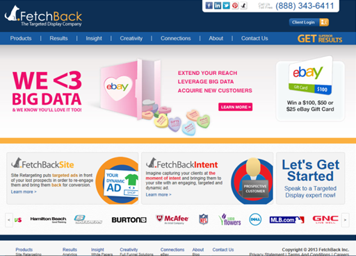 “FetchBack is a leading fully-managed, targeted display company, specializing in retargeting.” They offer an extensive ad network, covering almost 90% of the Internet, allowing advertisers the reach they need to keep their call to action, in this case, an ad, “front of mind” with their buyers.